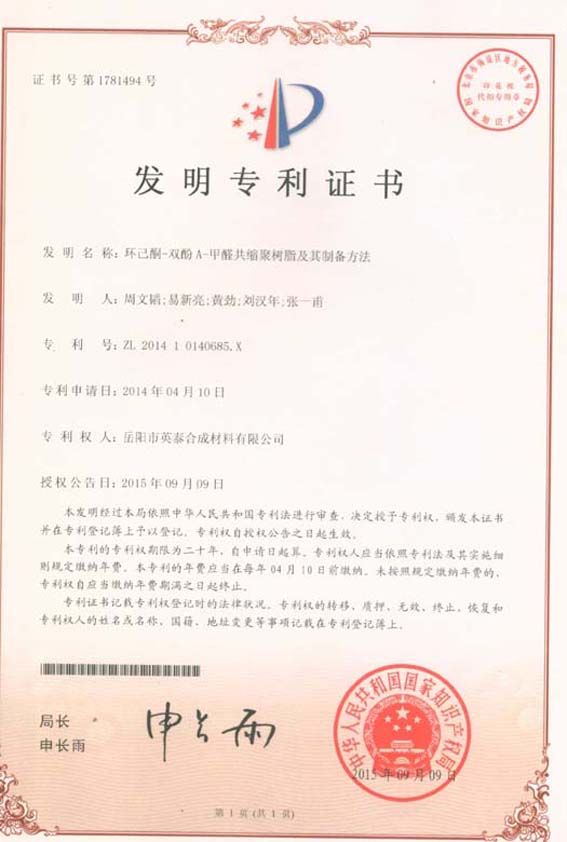 專利一:環己酮-雙酚A-甲醛共縮聚樹脂及其制備方法